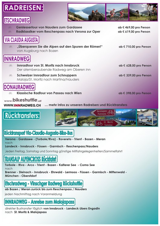 Ab sofort finden Sie unsere Radpauschaltouren inkl. Übernachtung/Hotel, Parkplatz, Gepäcksservice udn Rücktransport für die Genießertour vom Reschensee zum Gardasee, den Etschradweg-Klassiker von Nauders bis nach Verona, 2 versch. Innradtouren von Maloja/St. Moritz bis Nauders bzw. Innsbruck, die Via Claudia Augusta VCA Radtour von Augsburg bis Bozen und den Donauradweg von Passau bis Wien auf unseren Internetportalen - Weiterlesen...